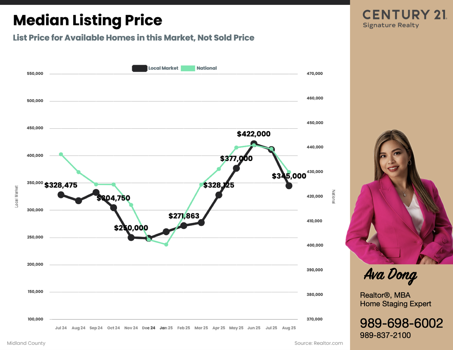 • As of August 2025, prices adjusted down slightly to $345,000, but still remain well above last year’s lows.