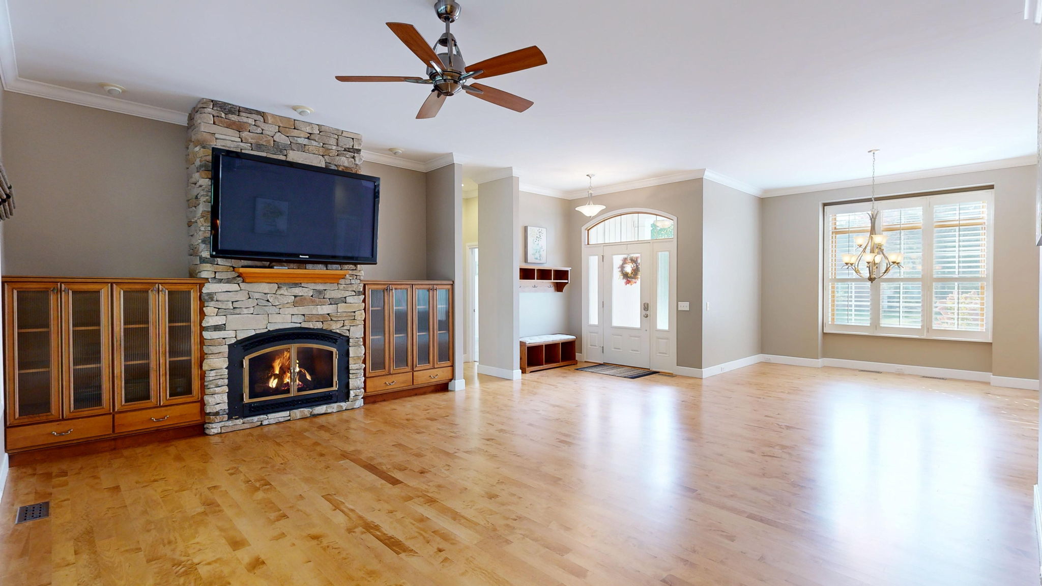 Picture: inviting foyer, soaring 10ft ceiling, gorgeous stone fireplace and the TV stays!